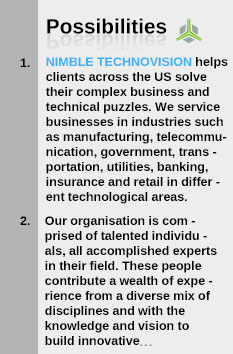 From managing your projects, to enhancing your staff, to educating your workforce, The Nimble Technovision is your single source for effective business solutions. Nimble Technovision is a professional services provider that is multi-faceted and multi- |